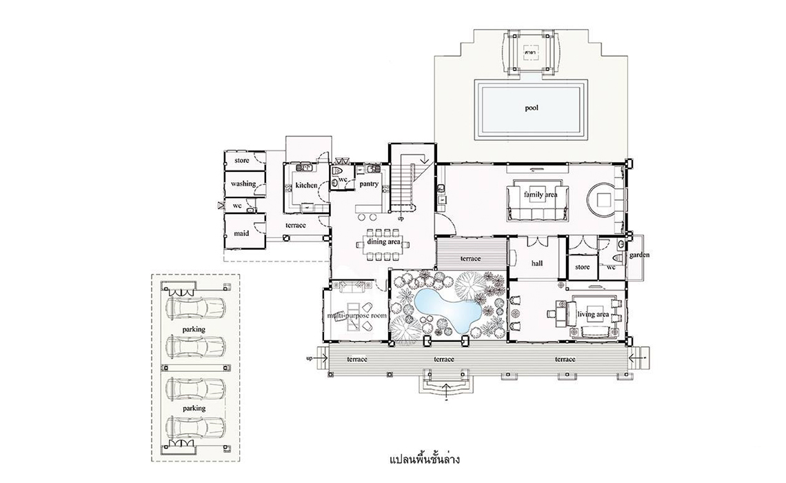 *ชั้นล่างประกอบด้วยห้องเอนกประสงค์, Family room ,ห้องรับแขก ,ห้องทานอาหาร, ห้องครัว,ห้องคนใช้,