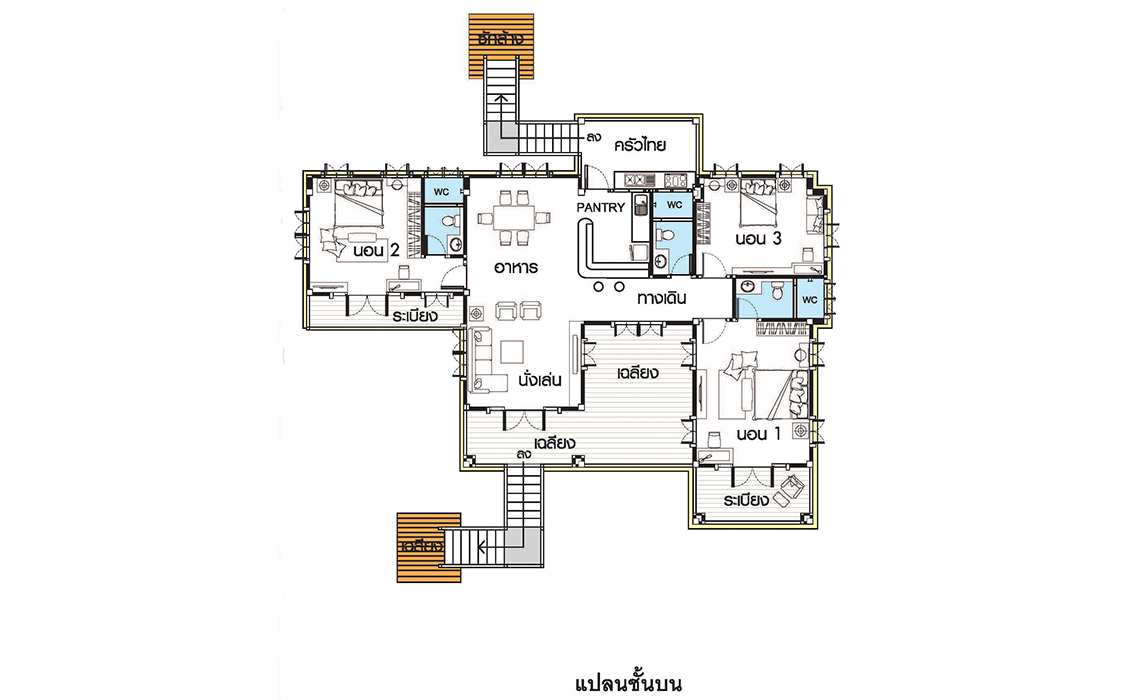 มี 3 ห้องนอน 3 ห้องน้ำ รูปทรงภายนอกสวยงาม โดดเด่นด้วยหลังคาทรงไทยประยุกต์ เน้นทางเข้าบ้าน ด้วยบันไดทางขึ้นชั้นบนด้านหน้า